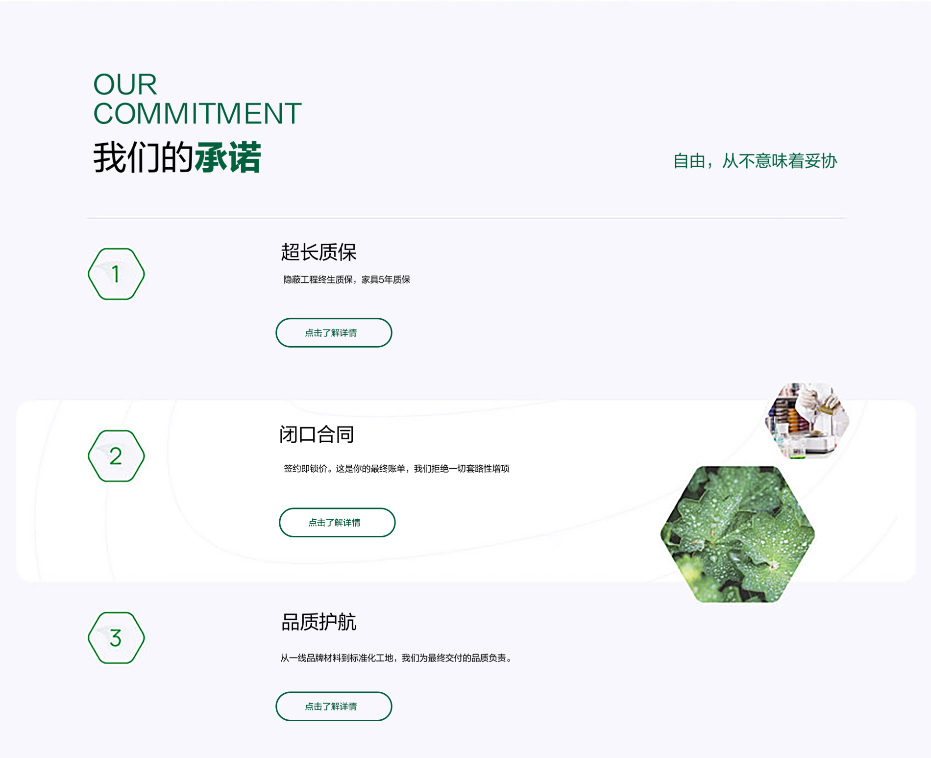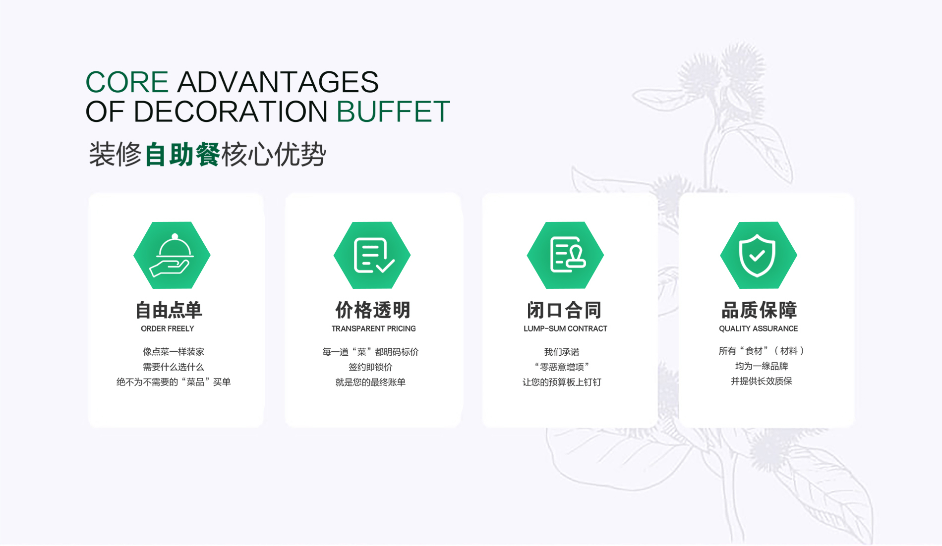 专业的客服人员,经验丰富的施工团队,庞大顶尖的设计团队,完善贴心的售后服务。同时结合消费者个性化需求,将其追求文化与风格相融合,量身打造符合客户生活品位、颜值与功能俱佳的“厂价直供的平价豪装平台”,全面覆盖家装市场目标人群。